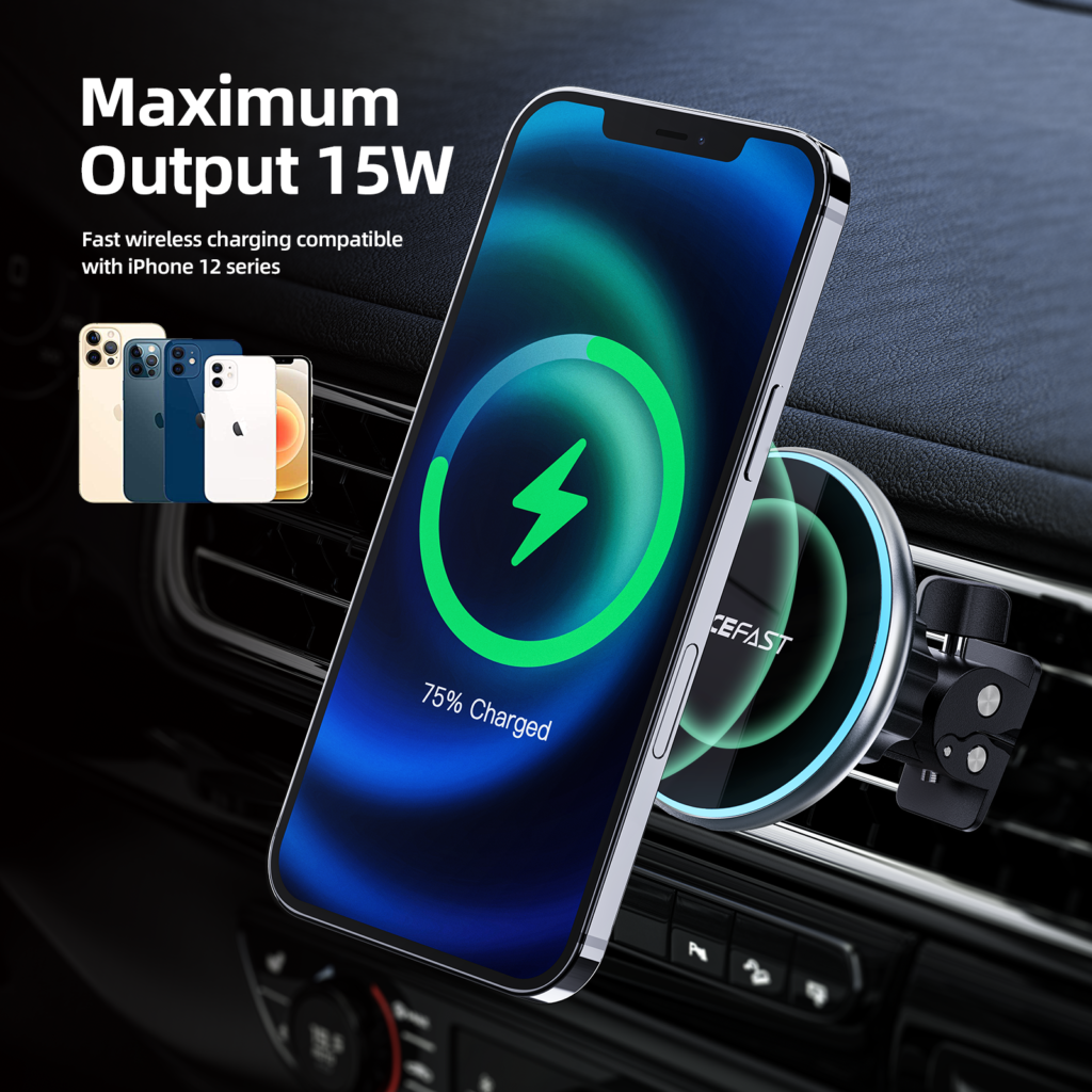 - Magnetic car holder with wireless charging function.