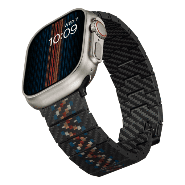 Enhance your Apple Watch with the Carbon Fiber Watch Band (Rhapsody), crafted using durable carbon and aramid fibers. Featuring lightweight comfort, a patented magnetic fastener, and a vibrant Mondrian-inspired design, this band offers style, strength, and ease of use for all-day wear.