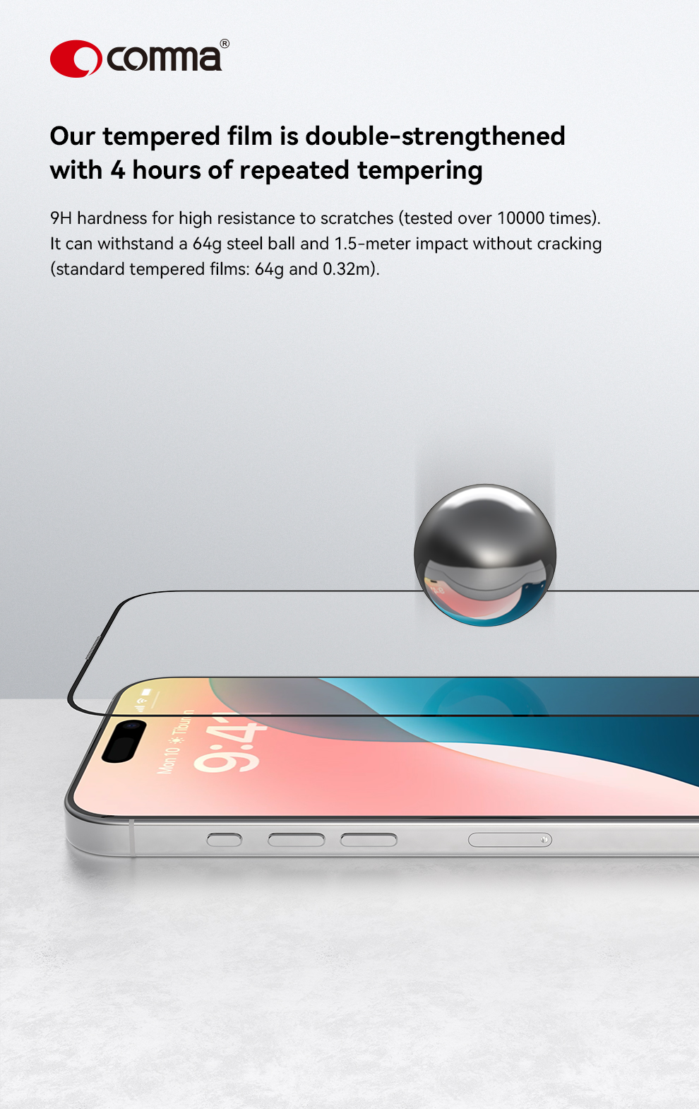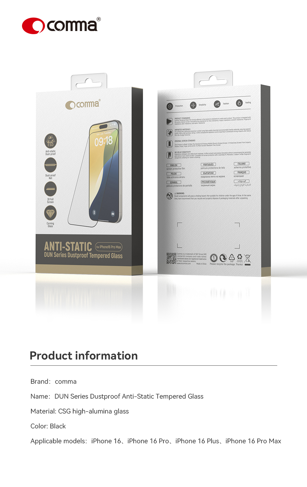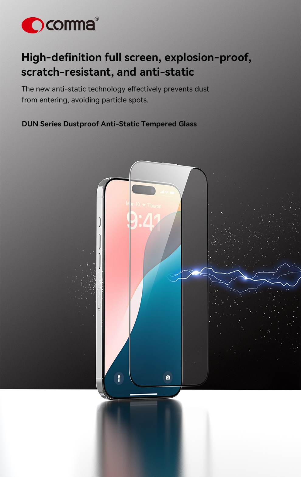 Comma DUN Series Dustproof Anti-Static Tempered Glass for iPhone 16/Plus/Pro/Pro Max