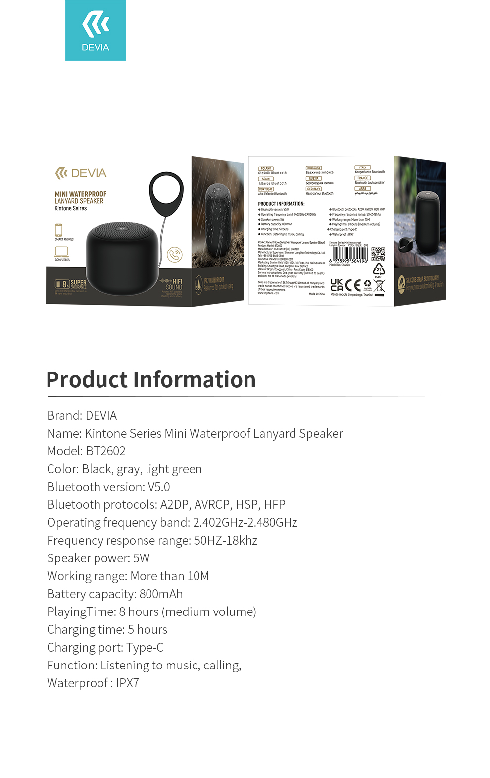 Devia Kintone Series Mini Waterproof Lanyard Speaker BT2602 – Black