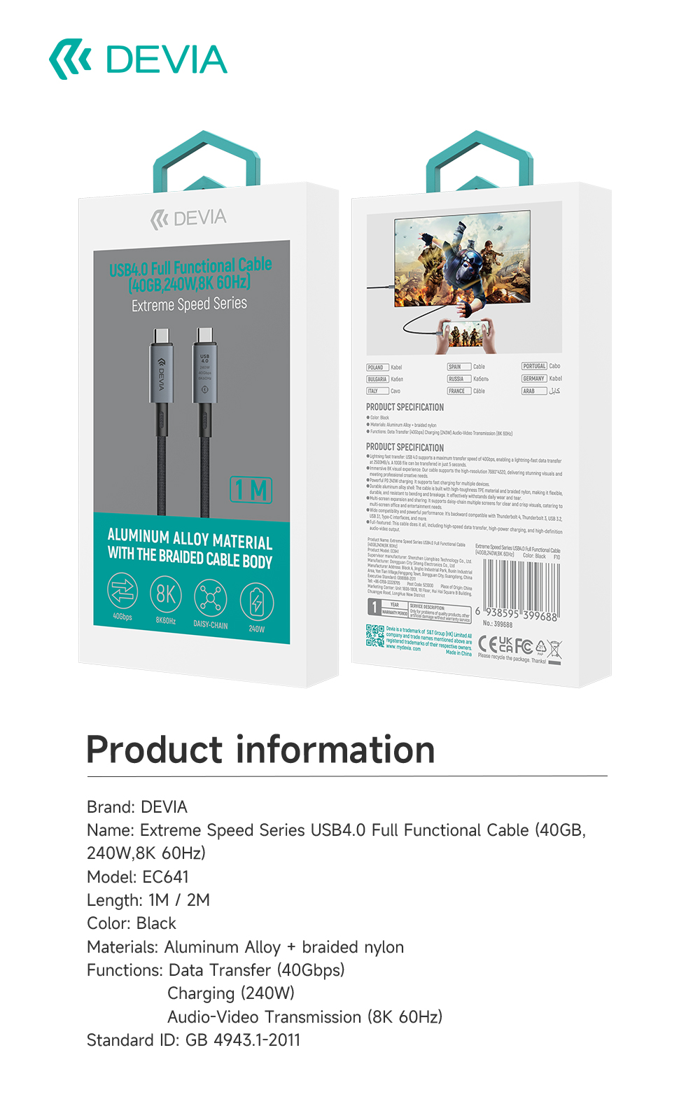 Devia Extreme Speed Series USB4.0 Full Functional Cable(40GB,240W,8K 60HZ)-1M