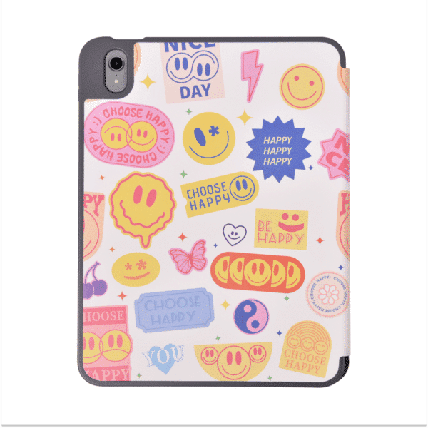 Colorful iPad case with a Happy Sticker design, pencil slot, intelligent wake/sleep feature, and versatile stand. Designed for iPad Air 11 (2024), iPad Air 5/4 10.9 (2022), and iPad Pro 4/3/2 11 (2022).