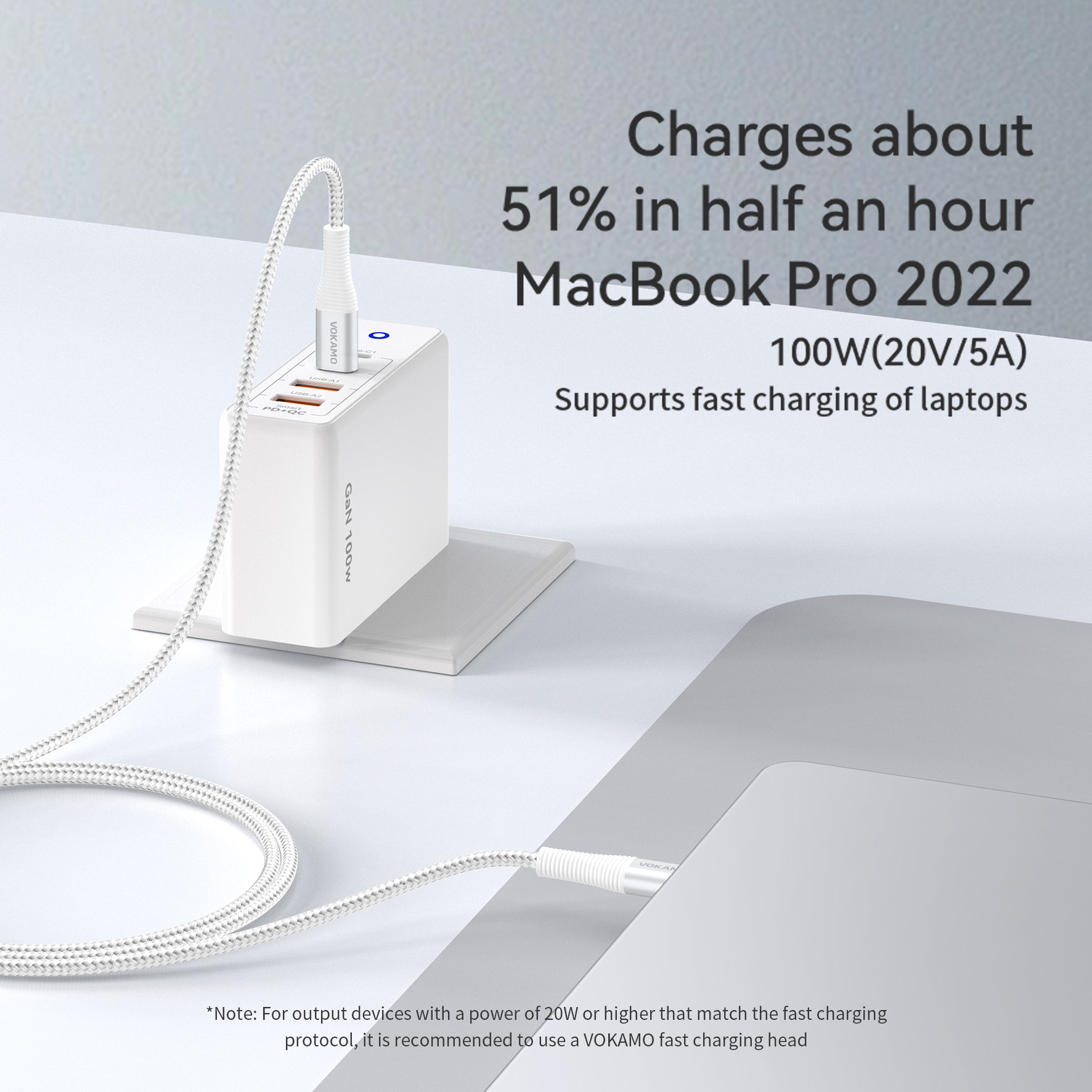 The VOKAMO Luxlink Series Type-C to Type-C Cable 100W (1.2M) – Silver delivers fast charging, seamless data transfer, and a durable braided design for all USB-C devices.