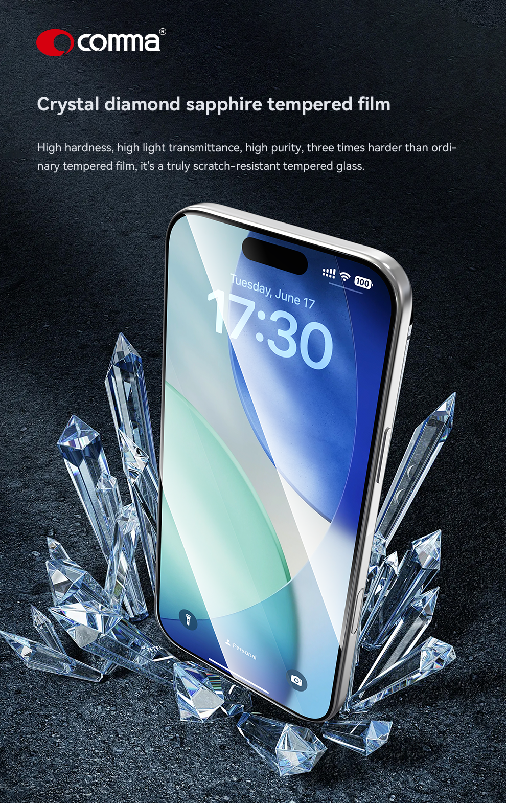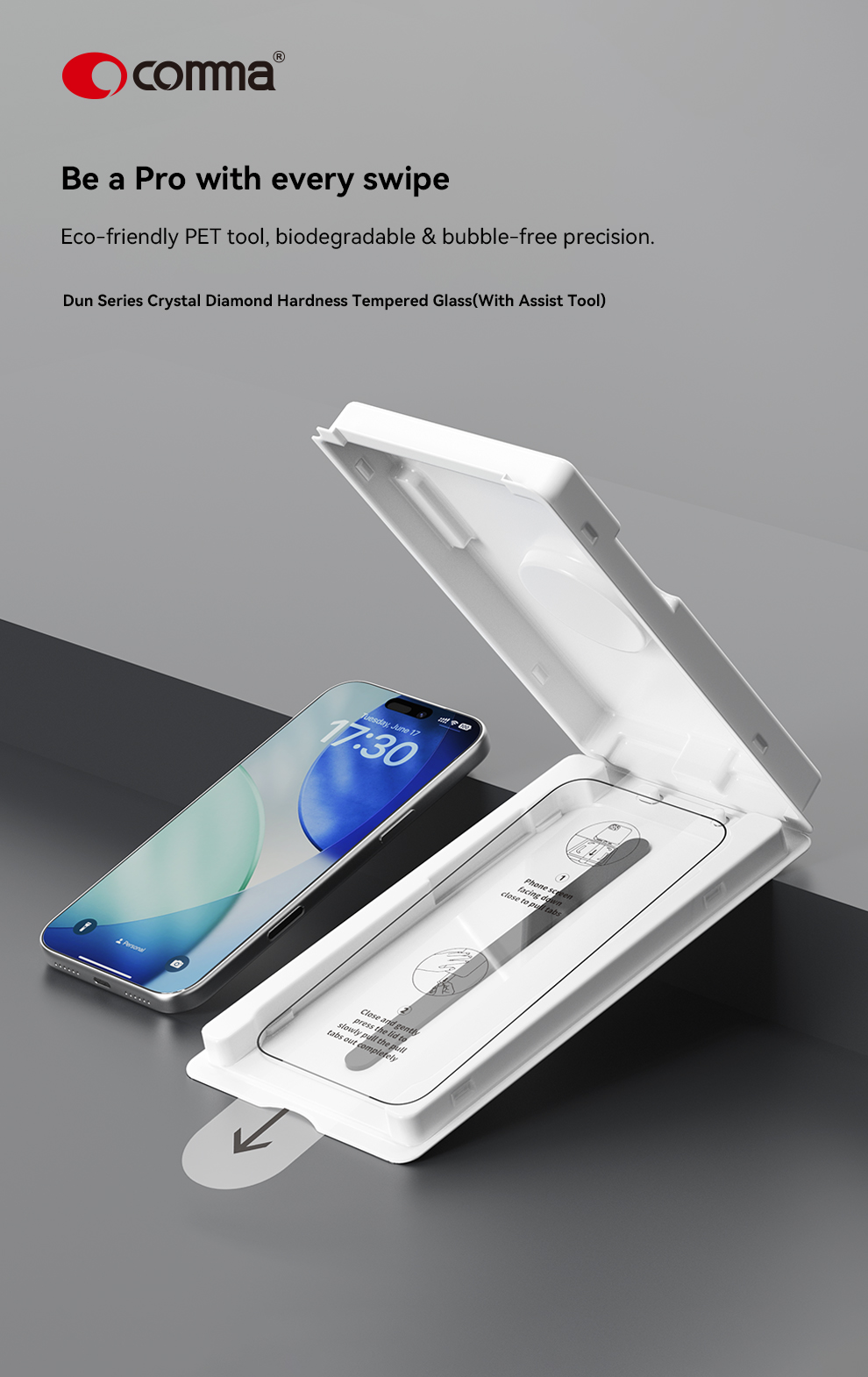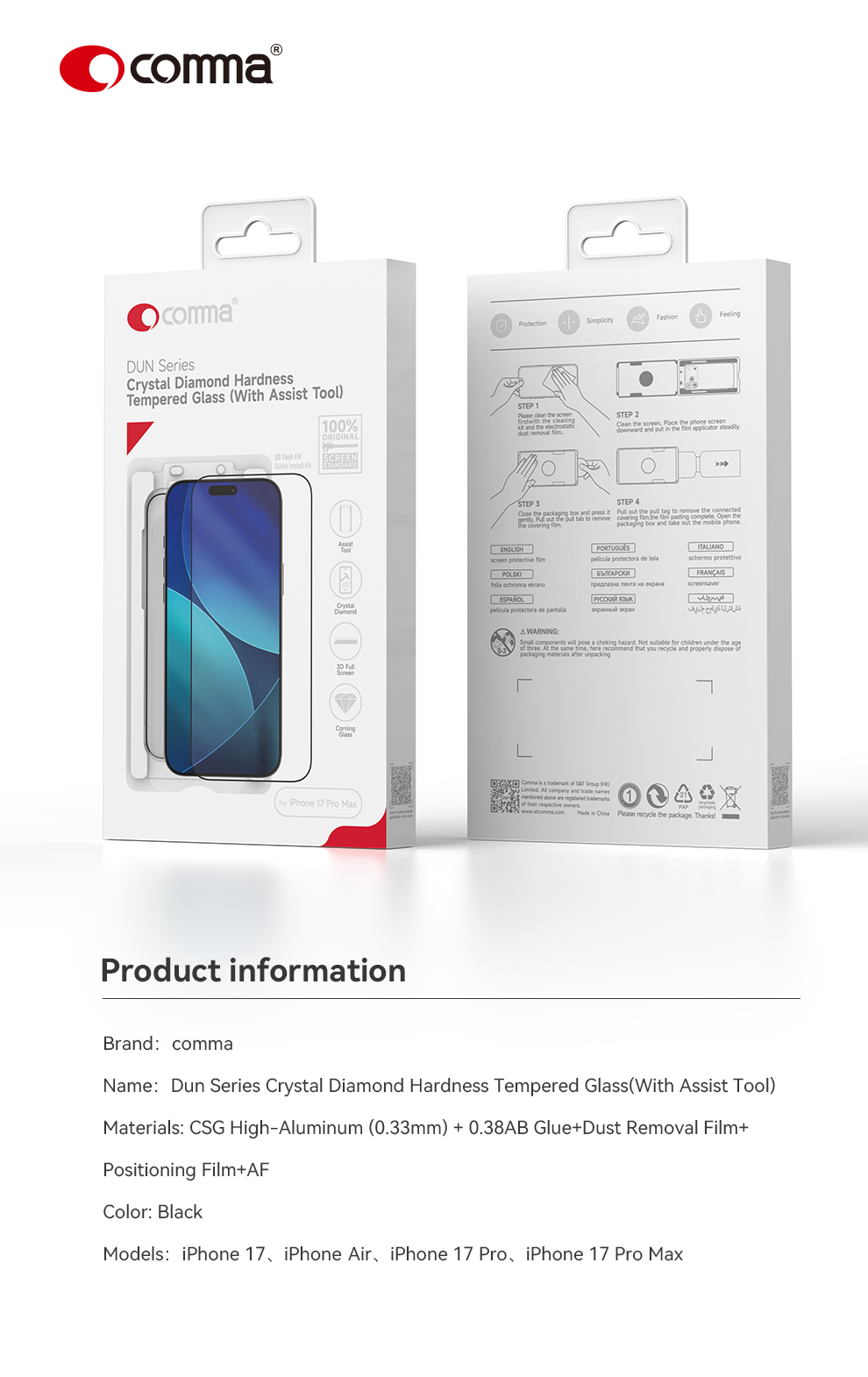 Comma Dun Series Crystal Diamond Hardness Tempered Glass(With Assist Tool) – iPhone 17 Pro Max – Black