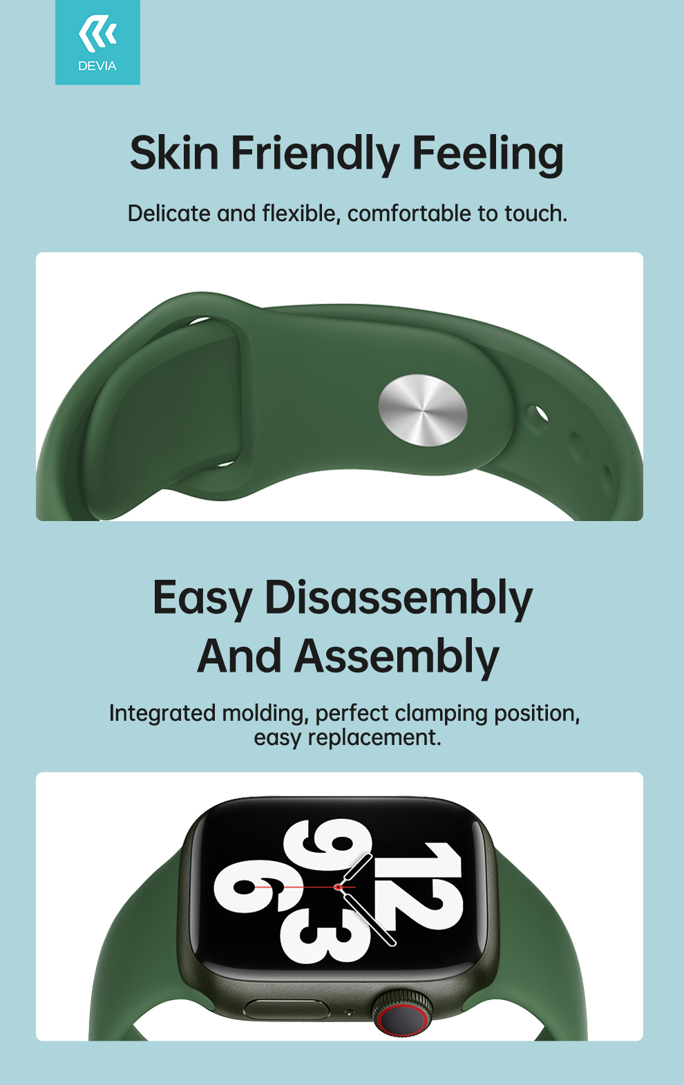 Add a refreshing touch to your Apple Watch with the DEVIA Deluxe Series Sport Watch Band in Clover. Crafted from premium silicone, this band is soft, lightweight, and skin-friendly, ensuring long-lasting comfort for all-day wear. Its sweat-resistant and washable material makes it perfect for workouts, sports, and everyday activities. The secure pin-and-tuck closure offers a snug and adjustable fit, while the vibrant Clover color adds a natural and stylish charm to your Apple Watch. Compatible with Apple Watch sizes 38|40|41|42|44|45mm.