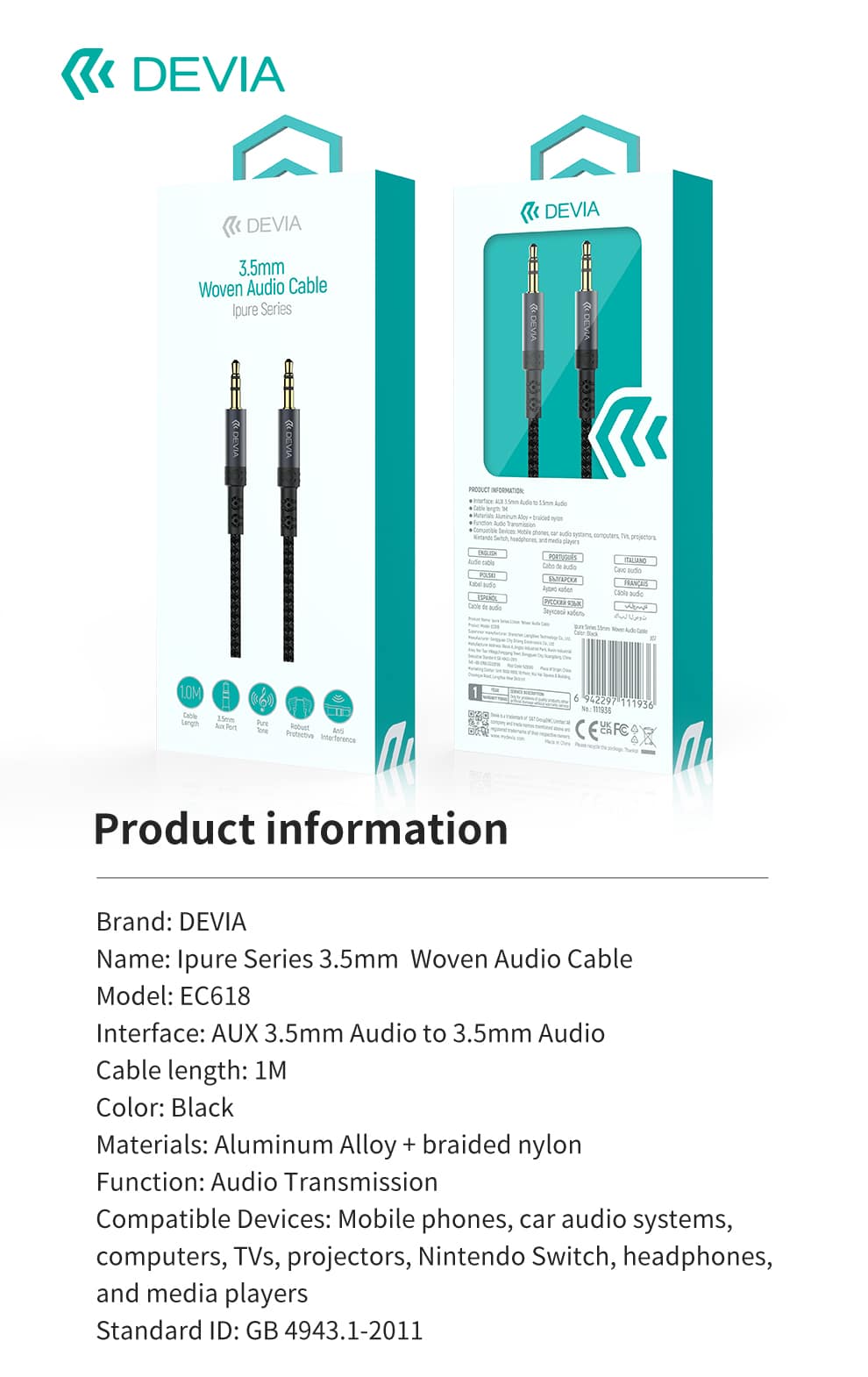 DEVIA Ipure Series 3.5mm Woven Audio Cable