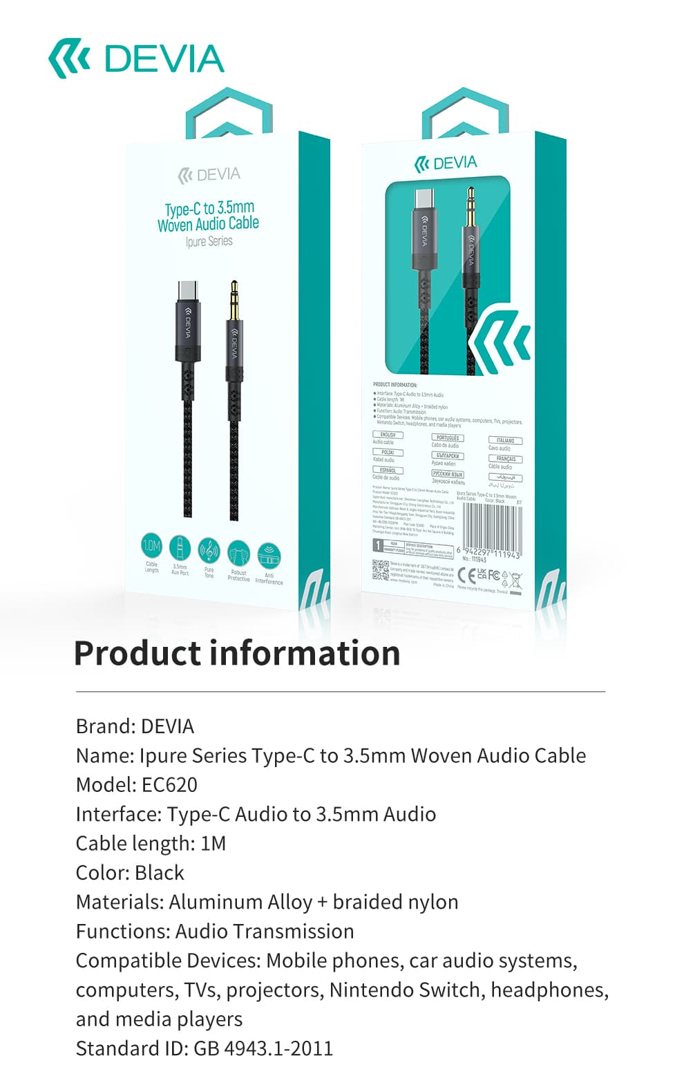 DEVIA Ipure Series Type-C to 3.5mm Woven Audio Cable