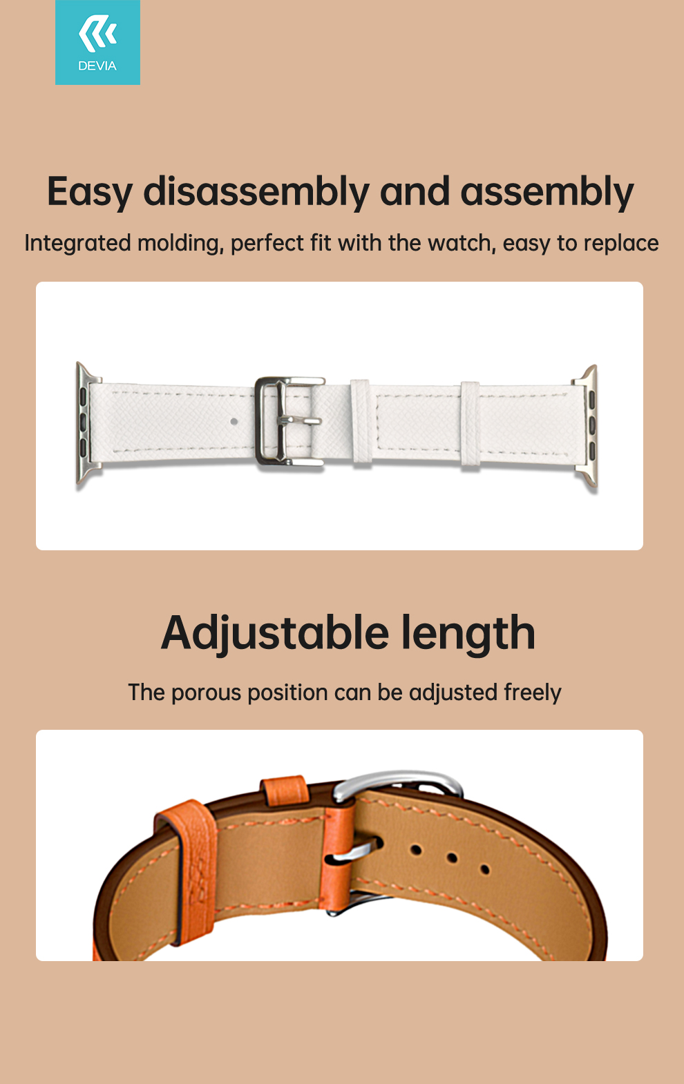 DEVIA Elegant PU Leather Watch Band in Brown for iWatch 38|40|41mm. Crafted with premium PU leather, featuring a secure metal buckle and adjustable length for style and comfort.