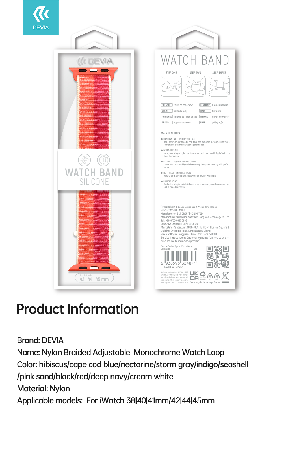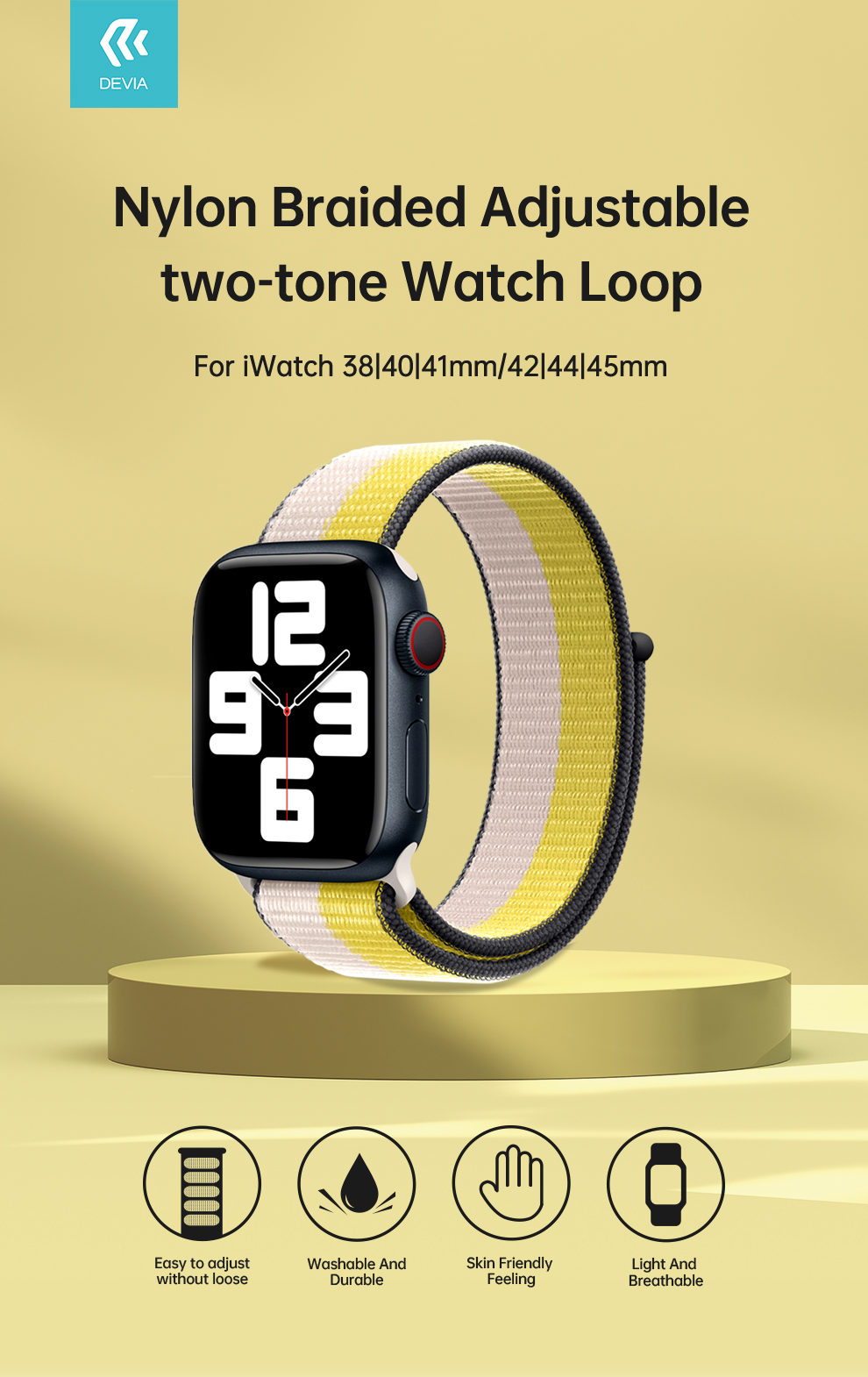 Enhance your Apple Watch with the DEVIA Nylon Braided Adjustable Two-Tone Watch Loop in lilac. Designed for Apple Watch sizes 38|40|41mm, this premium watch band offers exceptional comfort and durability. Crafted from high-quality nylon, it delivers a soft, breathable fit perfect for everyday wear. The vibrant Peony color adds a bold and stylish touch to any outfit, making it a versatile choice for all occasions.
