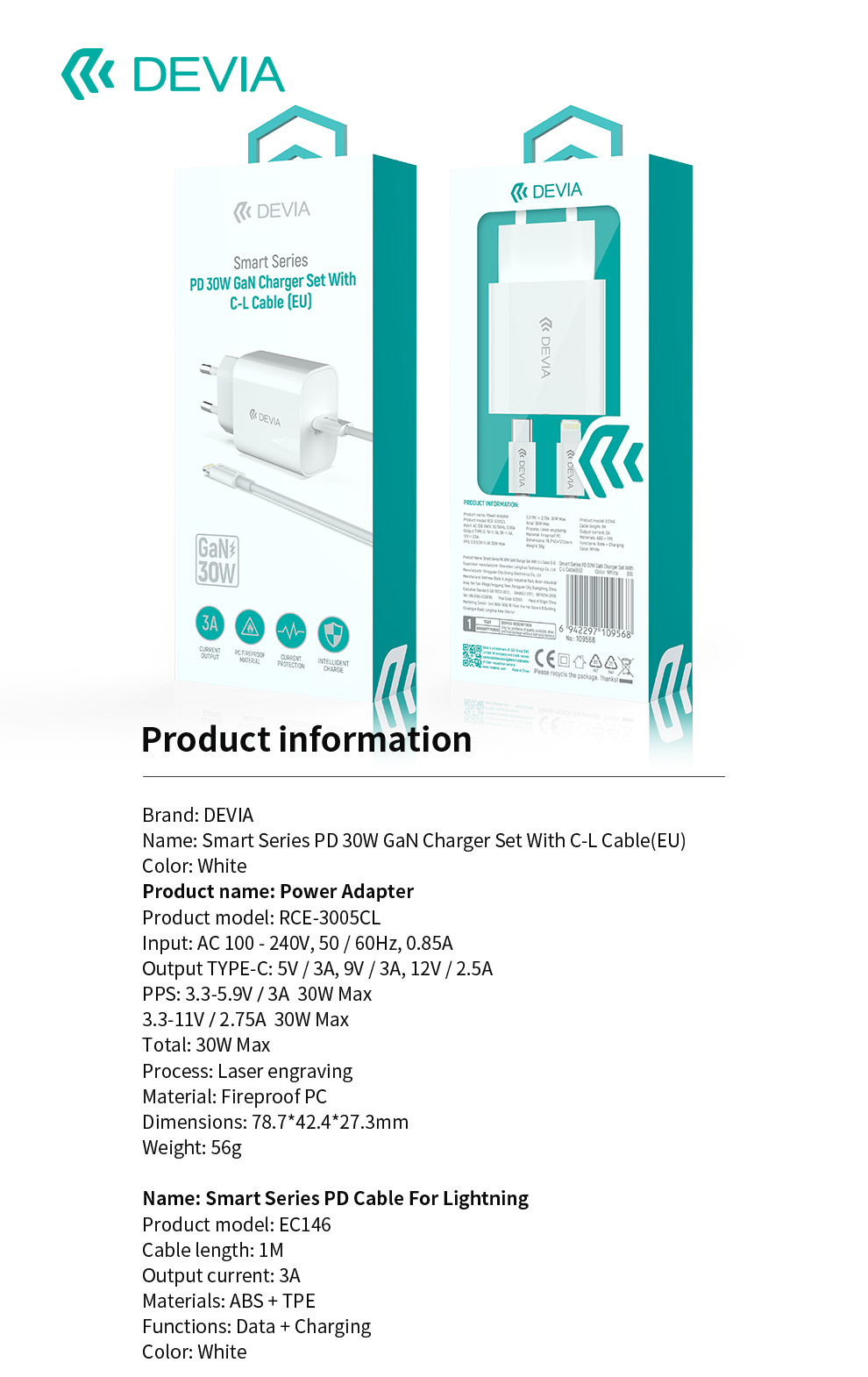 DEVIA Smart Series PD Quick Charger Set With Type-C Cable (EU ,25W)