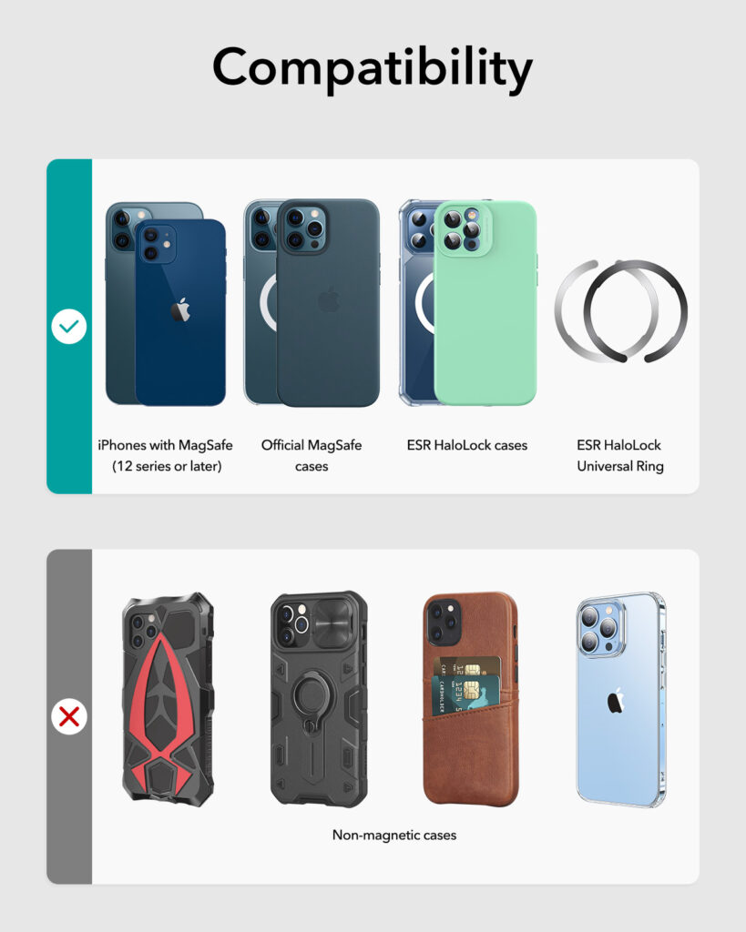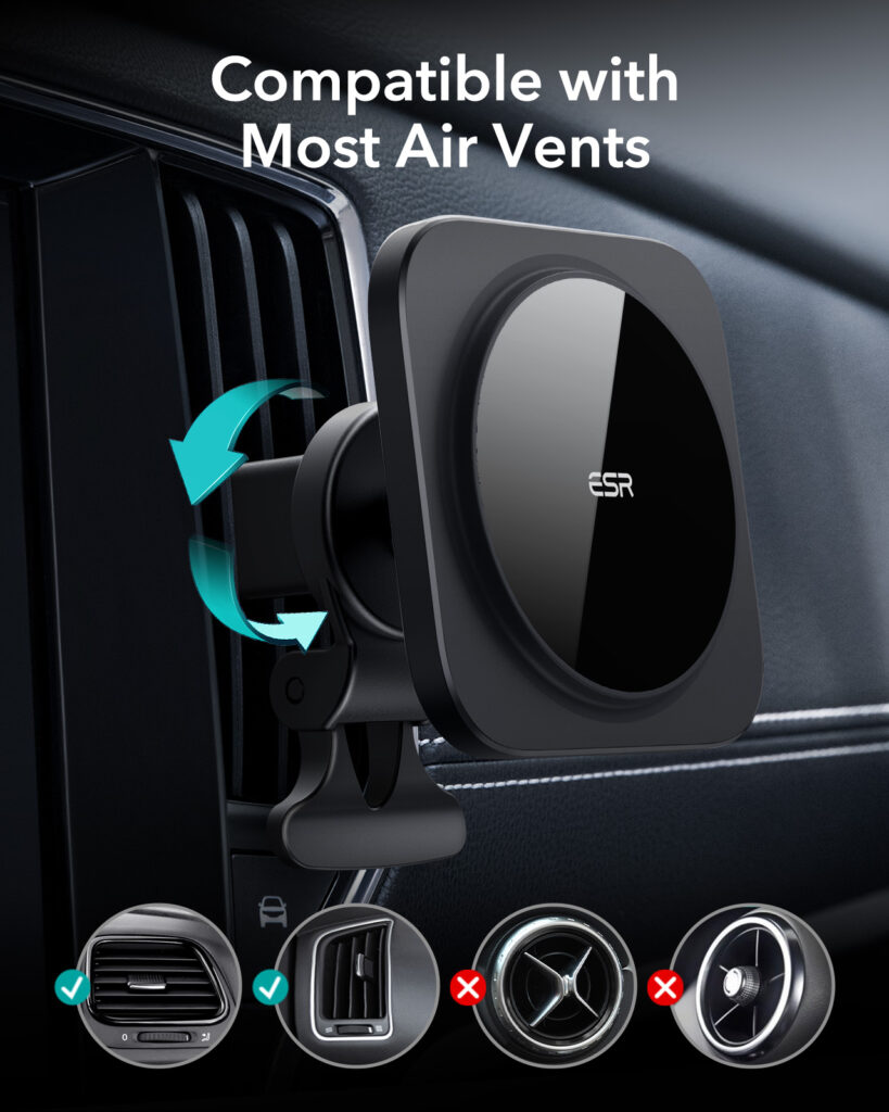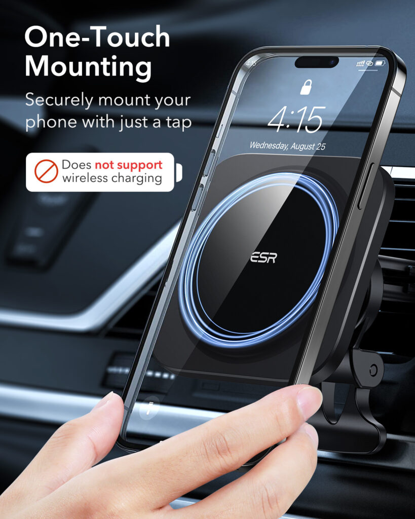 It automatically locks onto iPhone 14/13/12 series phones, official MagSafe cases, and ESR HaloLock cases; this product is a car phone mount, it does not support charging.