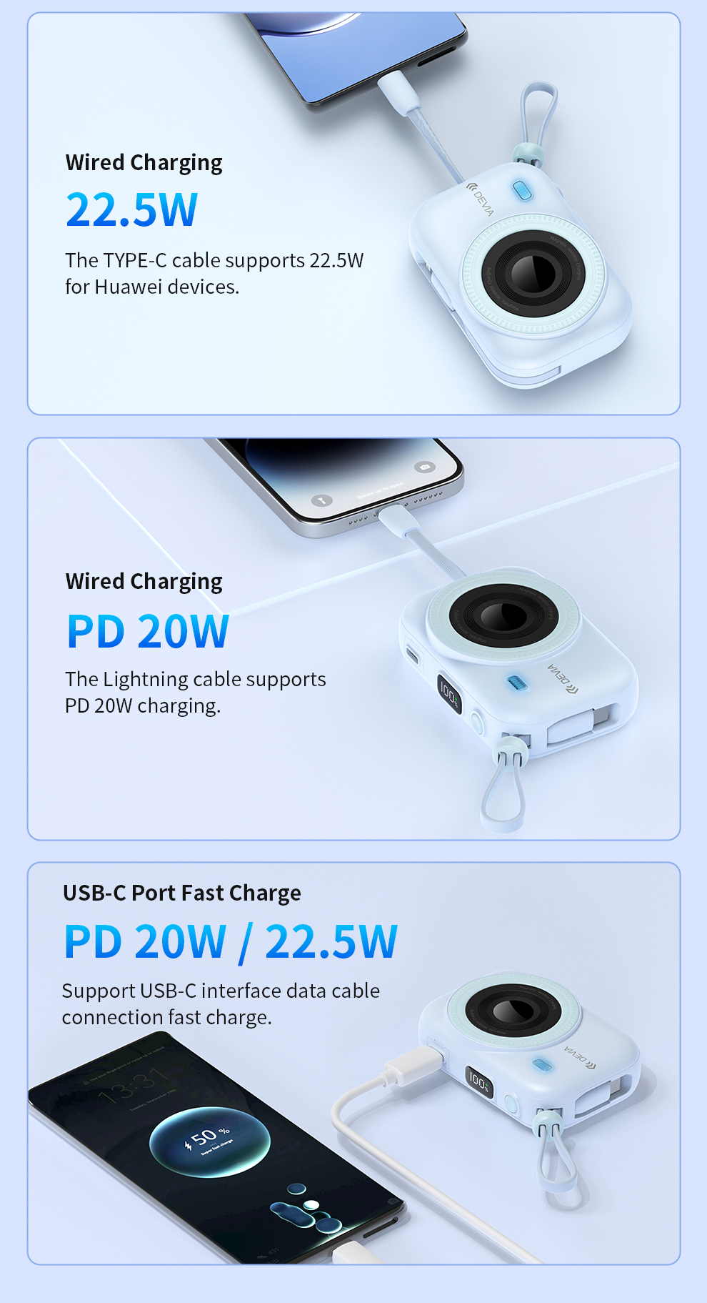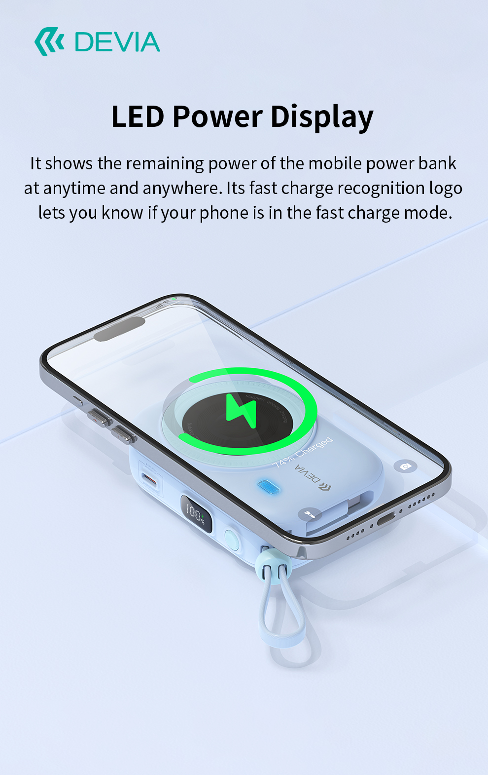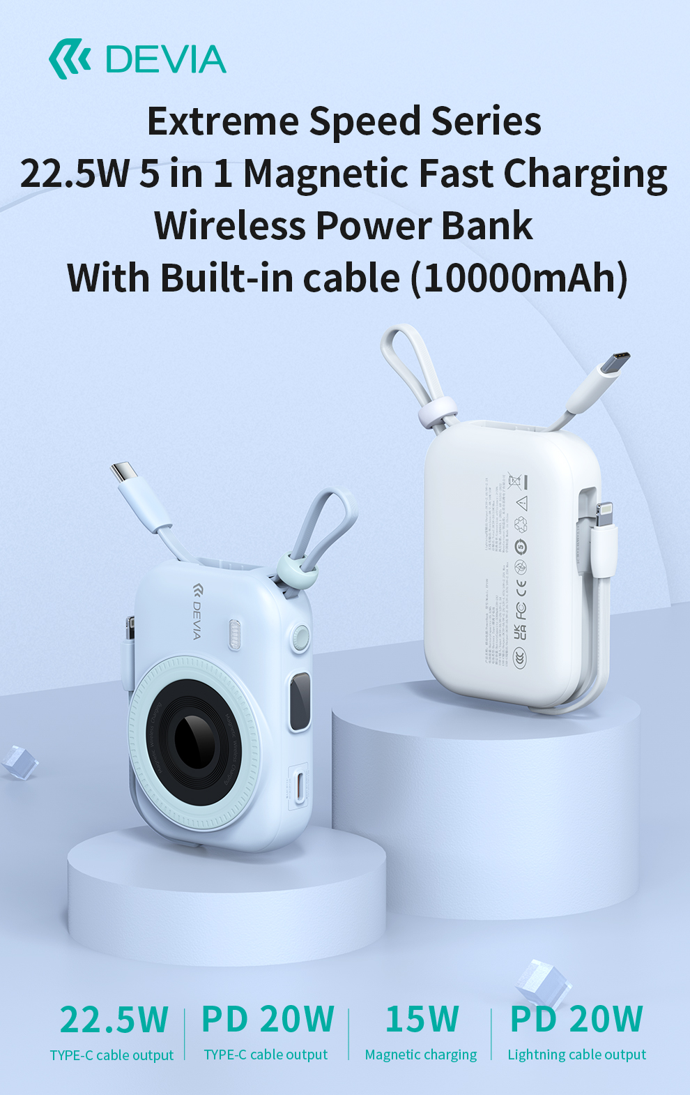 Devia Extreme Speed Series MINI 22.5W Magnetic Power Bank With Built-in 2 Cables (9600mAh) – White