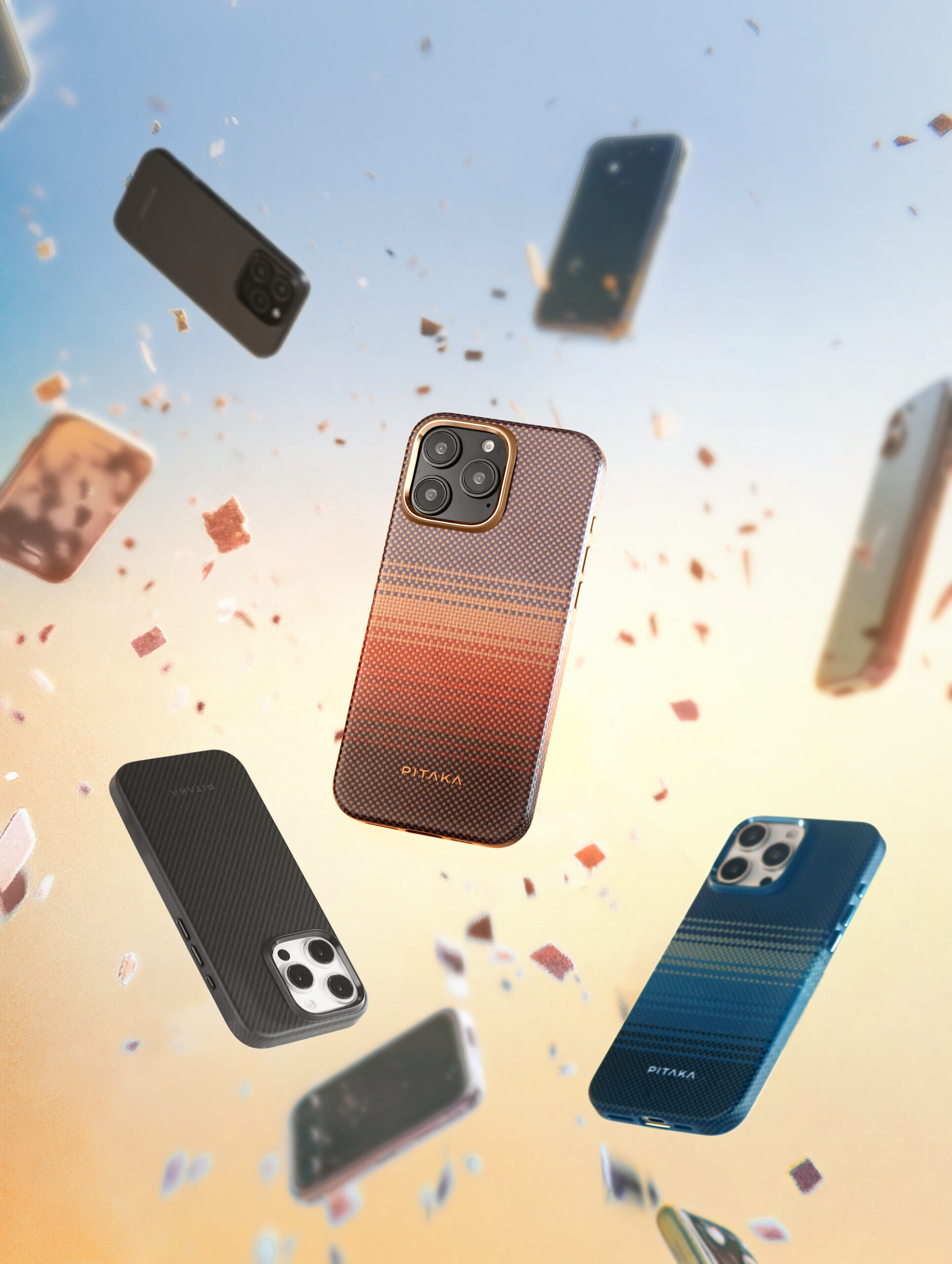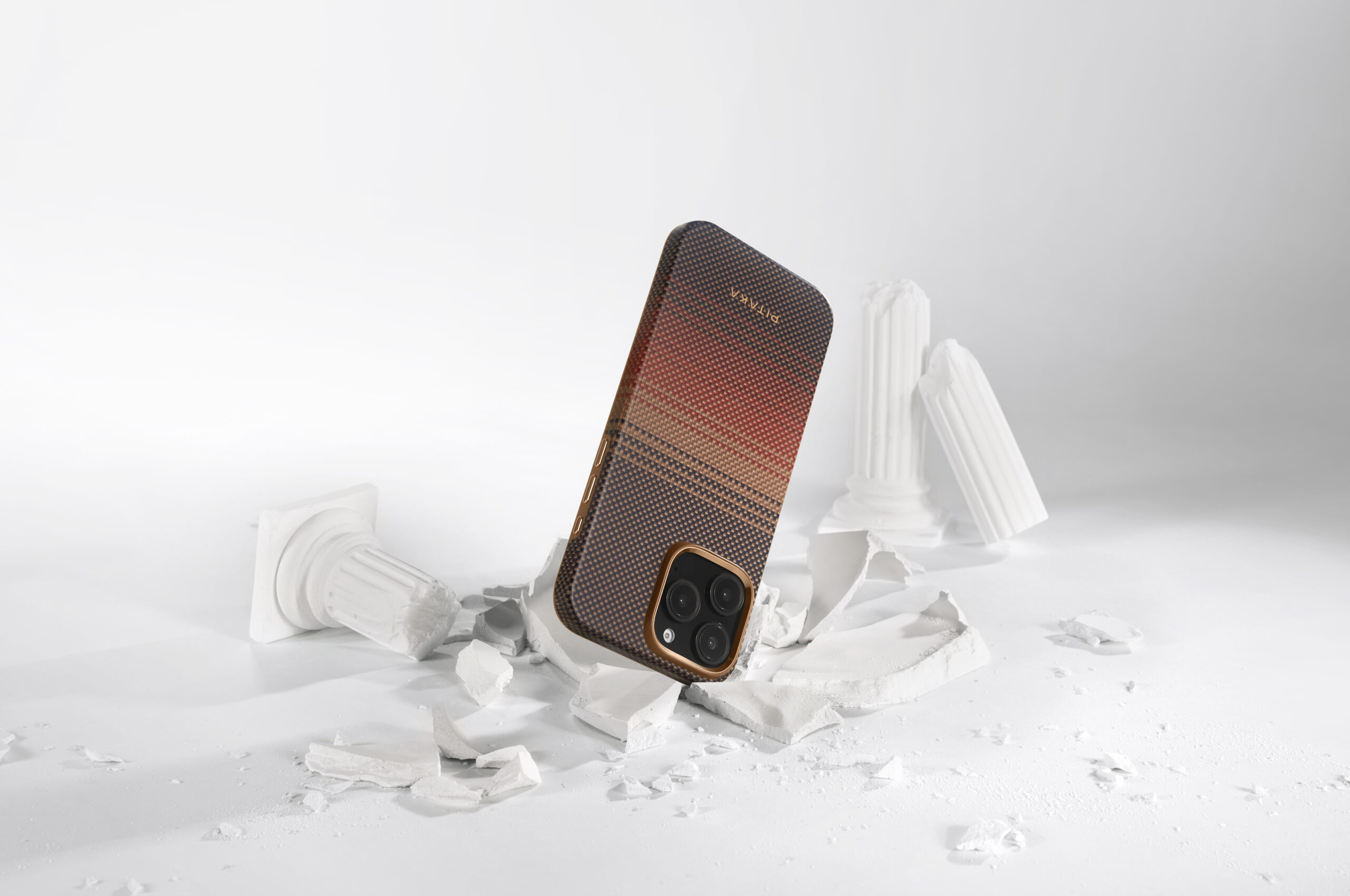 The PITAKA Sunset・Moonrise Military-Grade Protective Case in Sunset combines 600D aramid fiber strength, MagSafe compatibility, and stunning design for iPhone 16 Pro Max.