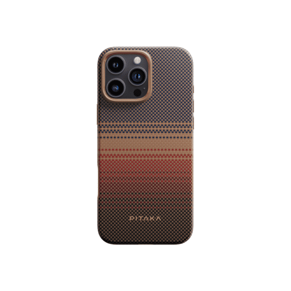 The PITAKA Sunset・Moonrise Military-Grade Protective Case in Sunset combines 600D aramid fiber strength, MagSafe compatibility, and stunning design for iPhone 16 Pro Max.